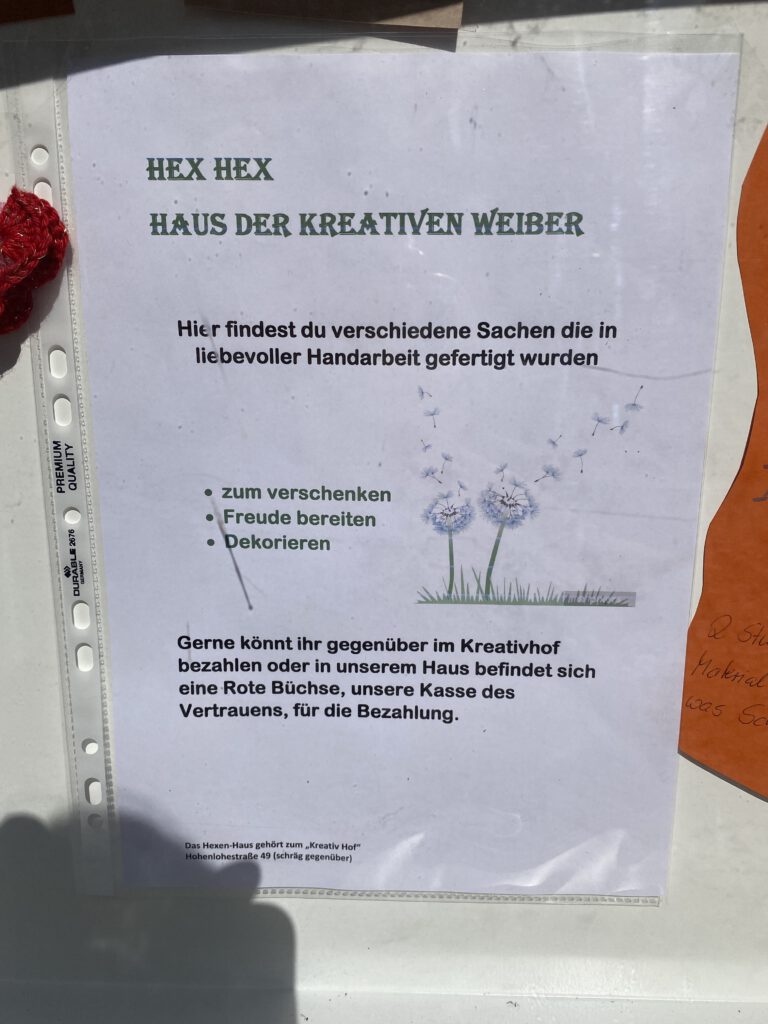 Initiatorin des Projektes ist Heidi Felsberg, die auf ihrem „Kreativhof“ gleich gegenüber nicht nur viele tolle Sachen für das Hex Hex Haus der kreativen Weiber herstellt, sondern auch verschiedene Workshops wie Töpfern, kreative Betongestaltung oder Kräutersalze & Salben herstellen anbietet.