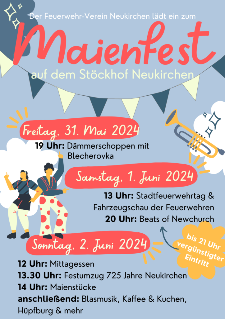 Ein besonderes Highlight ist der Festumzug anlässlich des 725. Jubiläums von Neukirchen. Im Anschluss an diesen finden die Maienstücke auf dem Festplatz statt. Später sorgt Blasmusik für einen geselligen Nachmittag. Für das leibliche Wohl ist selbstverständlich gesorgt.
