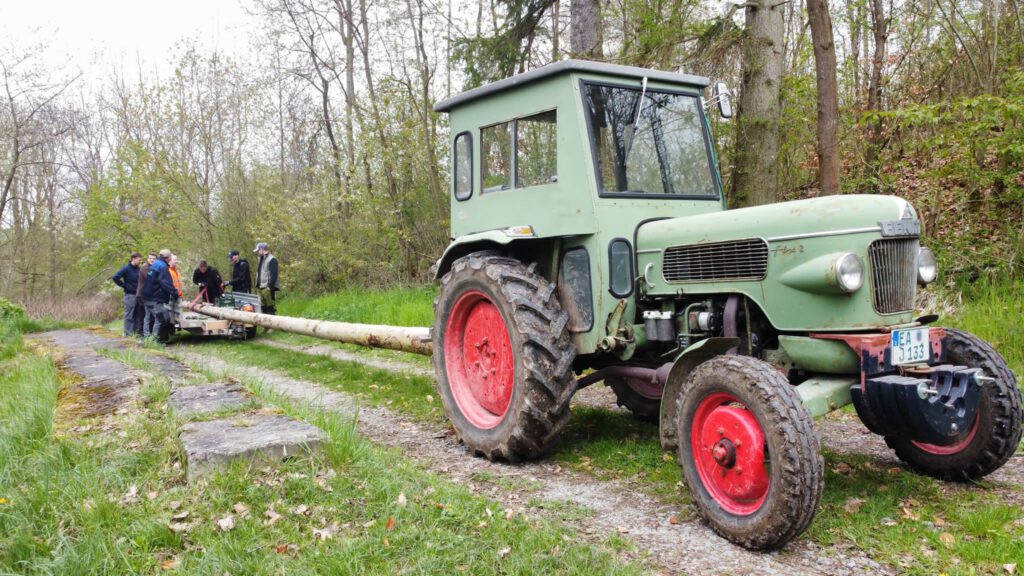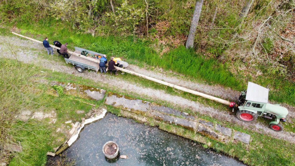 Ein eigens für diesen Zweck angefertigter Klappmechanismus am Fuß des Baumes soll auch in den kommenden Jahren dafür sorgen, dass der Maienbaum nicht nur kontrolliert aufgestellt, sondern auch „gefällt“ werden kann, ohne dabei beschädigt zu werden.