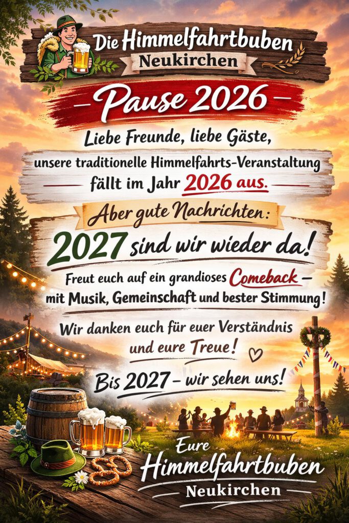 In diesem Jahr wird es keine Veranstaltung zu Himmelfahrt auf dem Neukirchner Stöckhof geben. Die Organisatoren legen eine Pause ein und sammeln Kraft für 2027. Denn dann soll die Tradition wieder fortgesetzt werden.